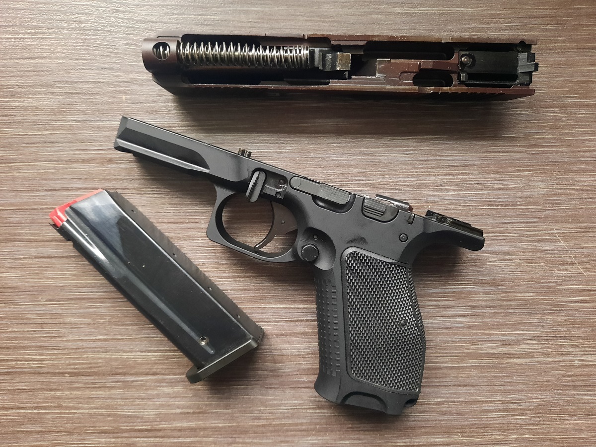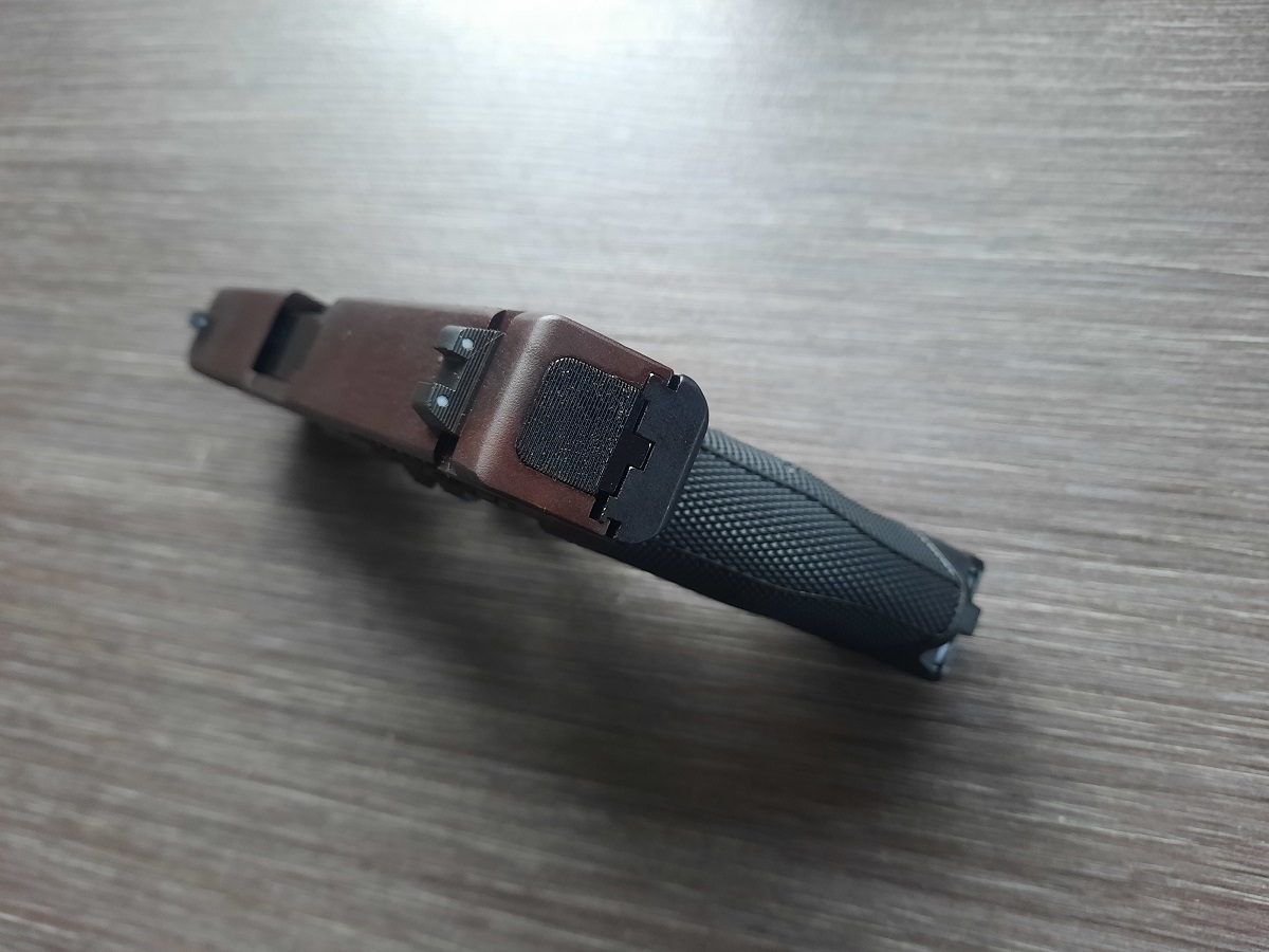 - Двухсторонние органы управления: предохранитель, затворная задержка и кнопка фиксации магазина, обеспечивающие удобство манипулирования пистолетом любой рукой, в том числе в перчатках.