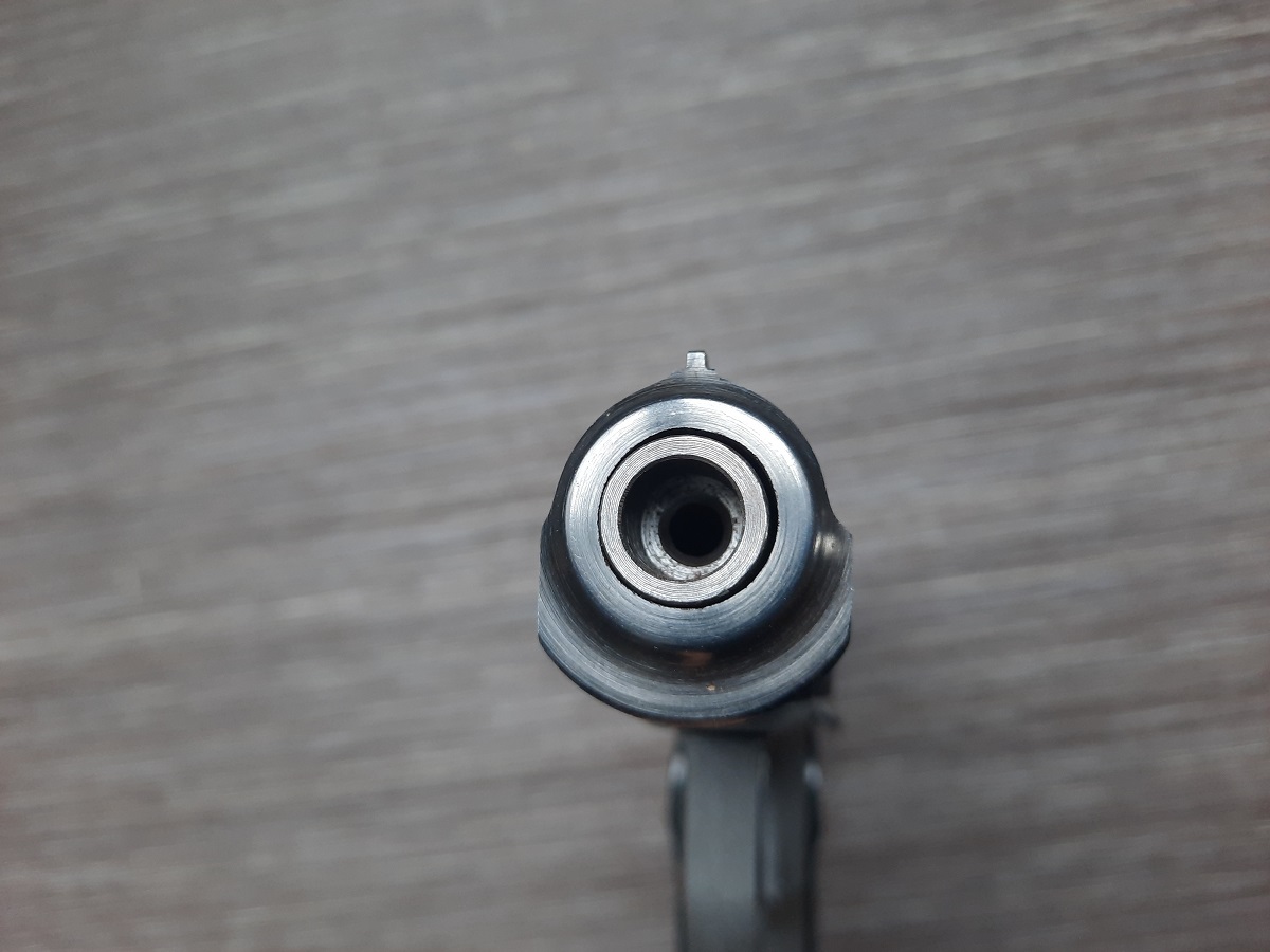 Прицельное устройство тоже в точности перенесено с боевого прототипа - это мушка и целик.