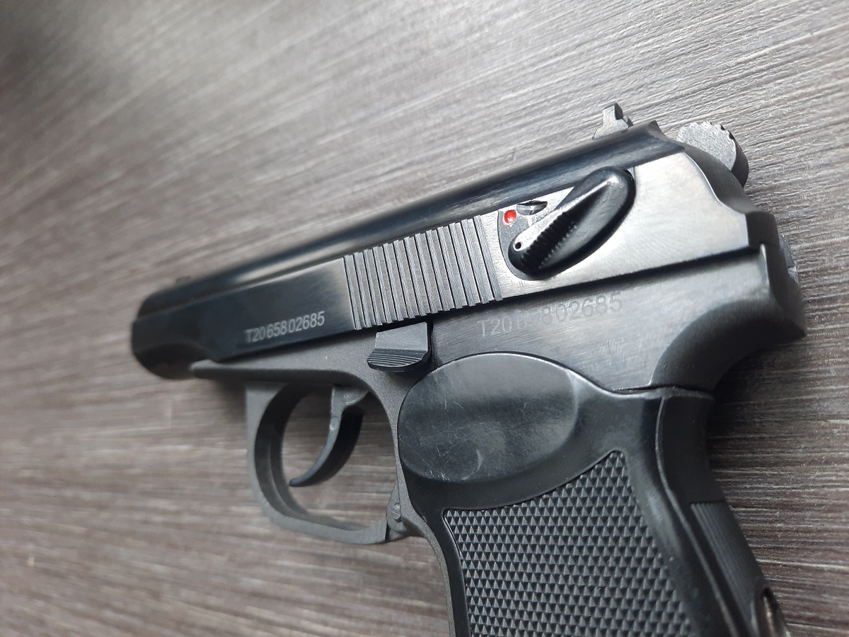 Описываемая модель оснащена точно таким же флажковым предохранителем на 2 позиции, как и боевой ПМ.