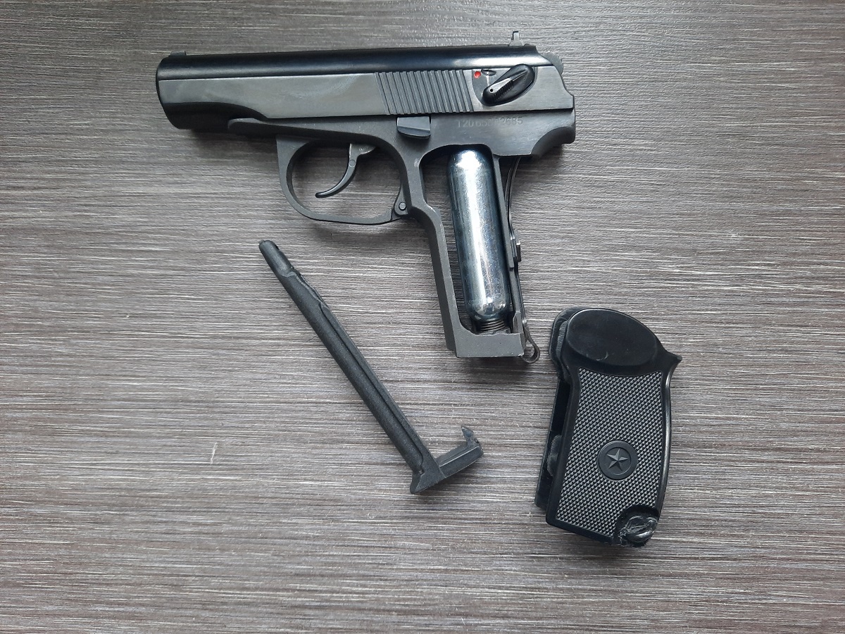 Корпус и все внутренние механизмы, в том числе ствол, изготовлены из металлического сплава, а накладки на рукоять - из пластика, как и у боевого ПМ.