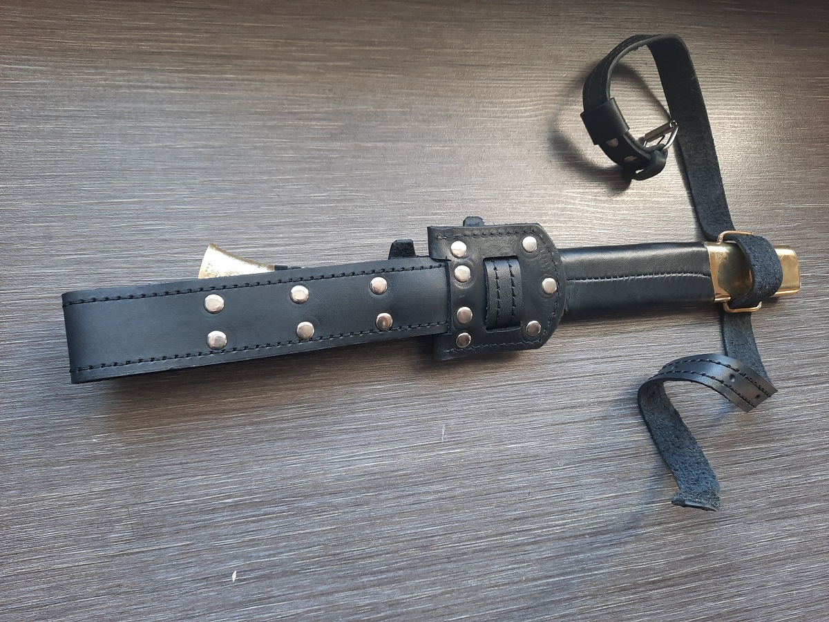 Крепится со стороны рукояти через шлевку на ремень, со стороны ножен крепится к ноге.